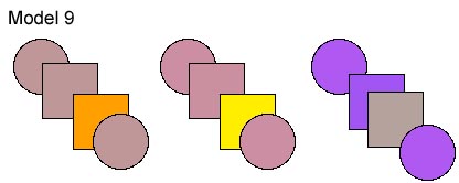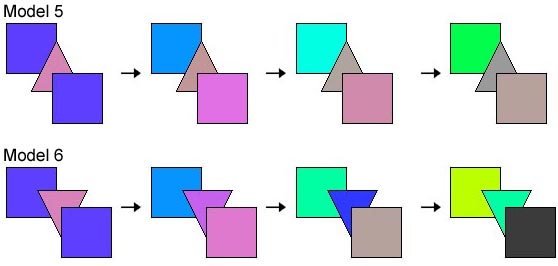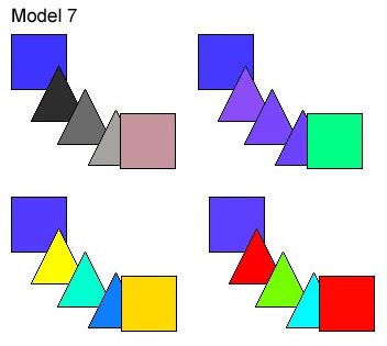 In addition to being effected by the value of the source level, rates values are effected by the amount of overlap with their source level. Triangles that have a high percentage of their area being overlapped by a square will have larger rate values. Also, destination levels will receive more "water" from a triangle that overlaps a larger area of the destination level's square. As before, squares that overlap on top of triangles act as source levels. Squares that are overlapped by the triangle are destination levels. When a triangle is overlapped by another triangle, the destination triangle (the one on the lower layer) takes as its value the value of source triangle squared. This squared rate value is then adjusted so that a source triangle with a value of 50 will create a destination triangle with a value of 50. A source triangle with a value of below 50 will create a destination triangle with a value below that of the source. A source triangle with a value above 50 will create a destination triangle with a value above that of its source. This is seen in Model 7. A gray source triangle (one that has a lower value) produces destination triangles with value that are even closer to 0 (and thus closer to black). A blue source triangle (with a value close to 50) produces destination triangles of about the same color/value. A cyan source triangle produces destination triangles that are closer to red (100). This allows the Constructivist Modeler to create nonlinear models. Unlike the previous models shown, the amount of overlap between 2 triangles has no effect on the value of either triangle.