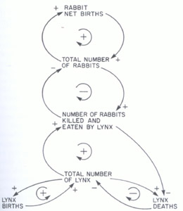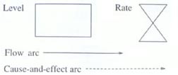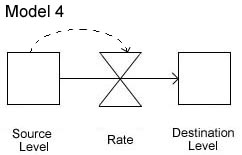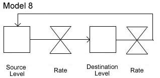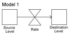 The Rules In traditional System Dynamics models, levels are represented by squares. Rates are represented by a symbol that resembles a valve (see image below). A flow of "water" from one level to another is represented by a line (called a "Flow arc") with an arrow to indicate the direction of the flow. If a rate is effected by its source level, this relationship is depicted with a dotted line, called a "Cause-and-effect arc."